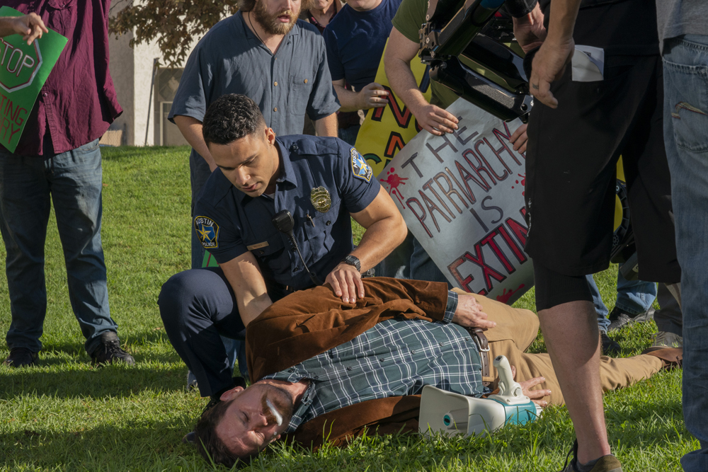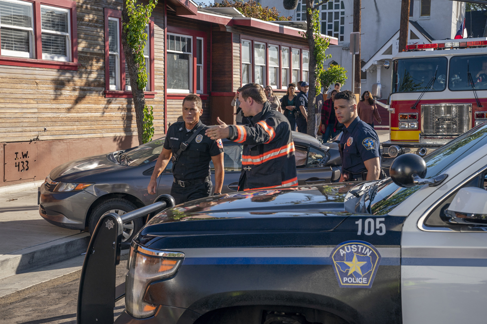 Owen and the crew race to a brawl at a male strip club, a fire at a bull semen factory and a protest where male toxicity is taken to a new level. Meanwhile, Paul tentatively goes out on a first date, Grace tries to reconnect with Judd and Owen faces the consequences of his chemo in the all-new “Studs” episode of 9-1-1: LONE STAR airing Monday, Feb. 10 (8:00-9:01 PM ET/PT) on FOX. (NLS-105) (TV-14 D, L, V)