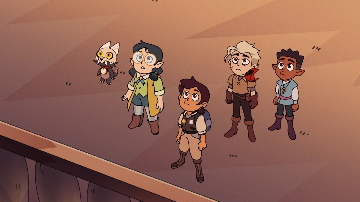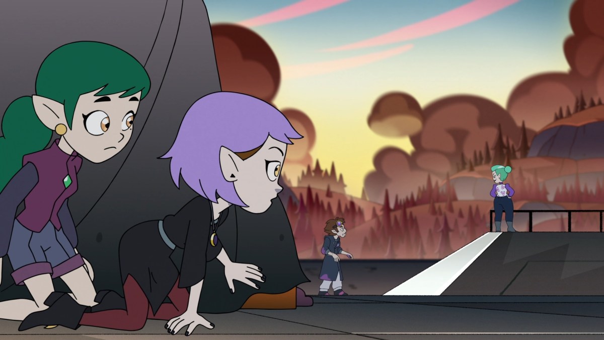 Raine approaches the three and calls for Eda to get moving. As they leave, Luz grabs Raine’s arm and makes them promise they’ll protect Eda. Raine rallies the troops and the group hisses like cats, invoking their name. Darius still isn’t amused.