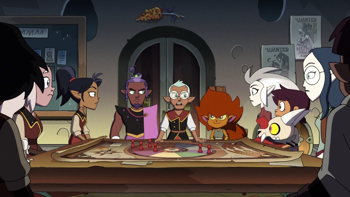 At The CATs headquarters, Luz gets a message from Amity telling her to come quick and that she’s grounded. King brings a box of disguises for the team. Lilith is excited but Hooty isn’t going to be tricked into wearing clothes!! King offers to help since he’s a Titan but Eda cuts him off, saying that it has to stay a secret between the five of them. King looks sad. Darius calls a meeting to go over the plans. Raine begins laying out the plan of attack. The Day of Unity begins in 24 hours. Everyone with a coven sigil will be taken out by the spell since it uses the magic of the nine houses. It is channeled through the coven heads during the eclipse. Belos has replacements for the heads should they go off script. Darius states that they can’t stop the spell but they can corrupt it. Eda’s curse warps magic, so she will be key. Darius will make a commotion using his abominations and sneak her into the tower. Eda will have to tap into the spell directly and take the place of a coven head, Raine’s specifically, sigil included. She would be flanked by Darius and Eberwolf so they can keep an eye out and incur it all goes according to plan. Lilith offers to use her curse in place of Eda. Eda stops her and says she hasn’t had her curse long enough and she has to be the one to do it.