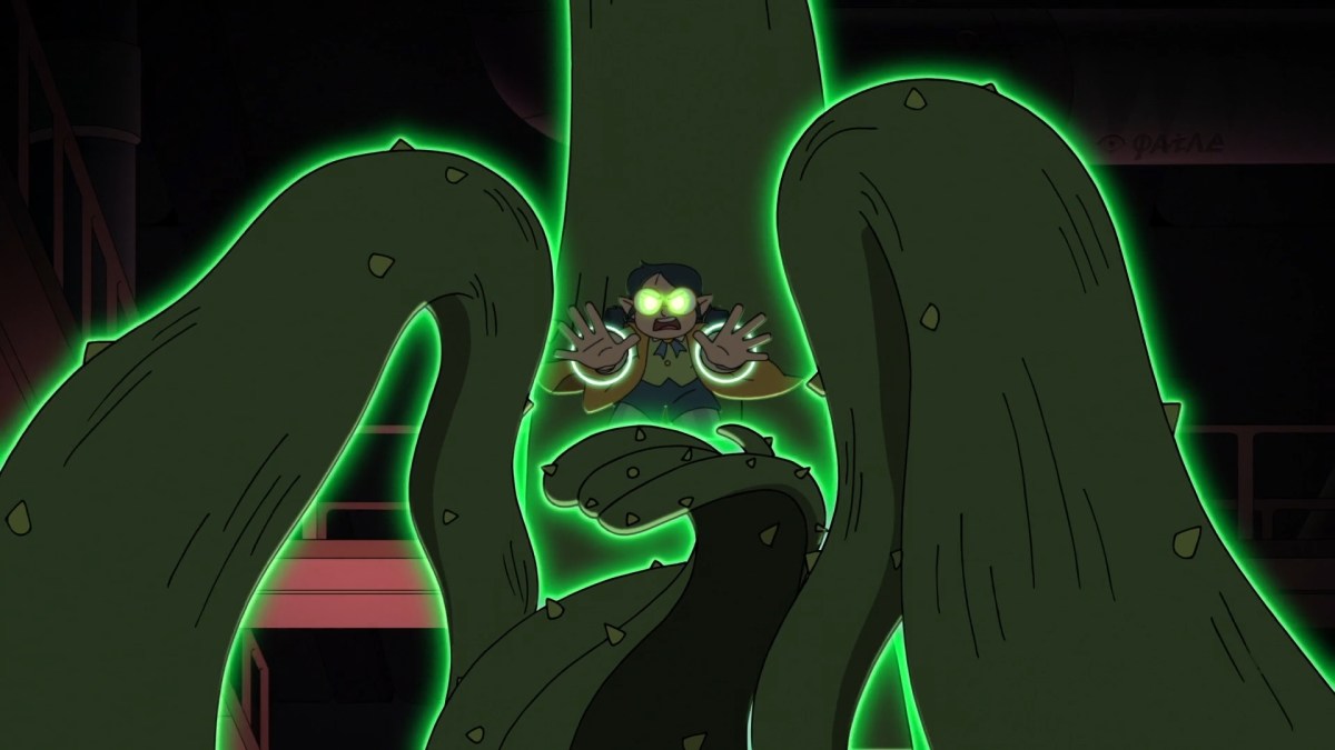 The group arrives at the Blight’s house. Gus spots a hidden guard using an illusion. Luz casts a plant spell taking him out. They run to the door but are stopped by an abomination. It grabs Luz, and King goes to help her. Hunter attacks the monster and Willow uses plant magic to destroy it. They get to Amity’s window and Luz blushes. She uses a plant spell to lift herself to her balcony.