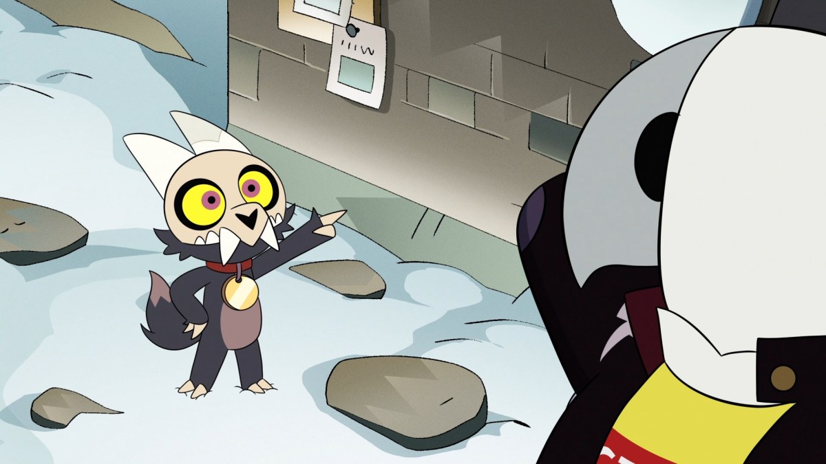 Hooty notices wanted signs are up for Eda, Lilith, King, Luz and Hooty. They decide to take the long way home to avoid getting spotted. As they get close to home, they see scouts carrying confiscated items from the house, one item being Francois. They run to the house and find it empty. Luz spots a note with a hidden message on it saying they’re hiding at the knee.