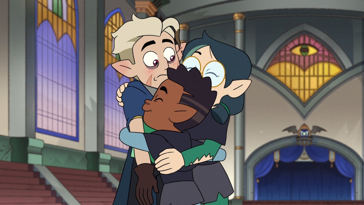 Amity still can’t believe Gus took down a coven head. Gus is amazed he didn’t go down with him. The rest of the students approach Hunter asking what is going on at the castle and if it’s true that he abandoned the Coven. Ed asks the real question: if Hunter has ever sneezed with his mask on!! He answers each question. Everyone at the castle is heading to the head of the Titan for the day of Unity. Hunter thinks he left the coven. He also has sneezed in his mask before. Ed is grossed out by the answer. Hunter then reveals that Belos has been lying to everyone and that the Day of Unity isn’t about magic or the Titan. Willow and Amity hold each other’s hand. Hunter apologies and says there’s a lot to explain. Bump tells him that he better get started.