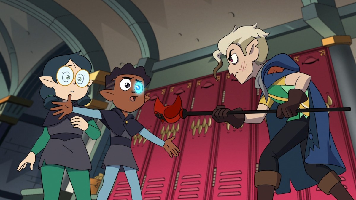 Willow and Amity run through illusions together. The illusion stops changing and they don’t know how they got where they are when Willow realizes it’s all an illusion. Amity gets a text from her siblings telling her they’re all hiding together with Bump and they should join them. A scout begins to appear behind Willow and Amity yells to watch out. Just then Willow uses her plant magic to catch the scout. Amity tells her good shot, which bugs Willow. Even the scout tells her he knows she got him fair and square.