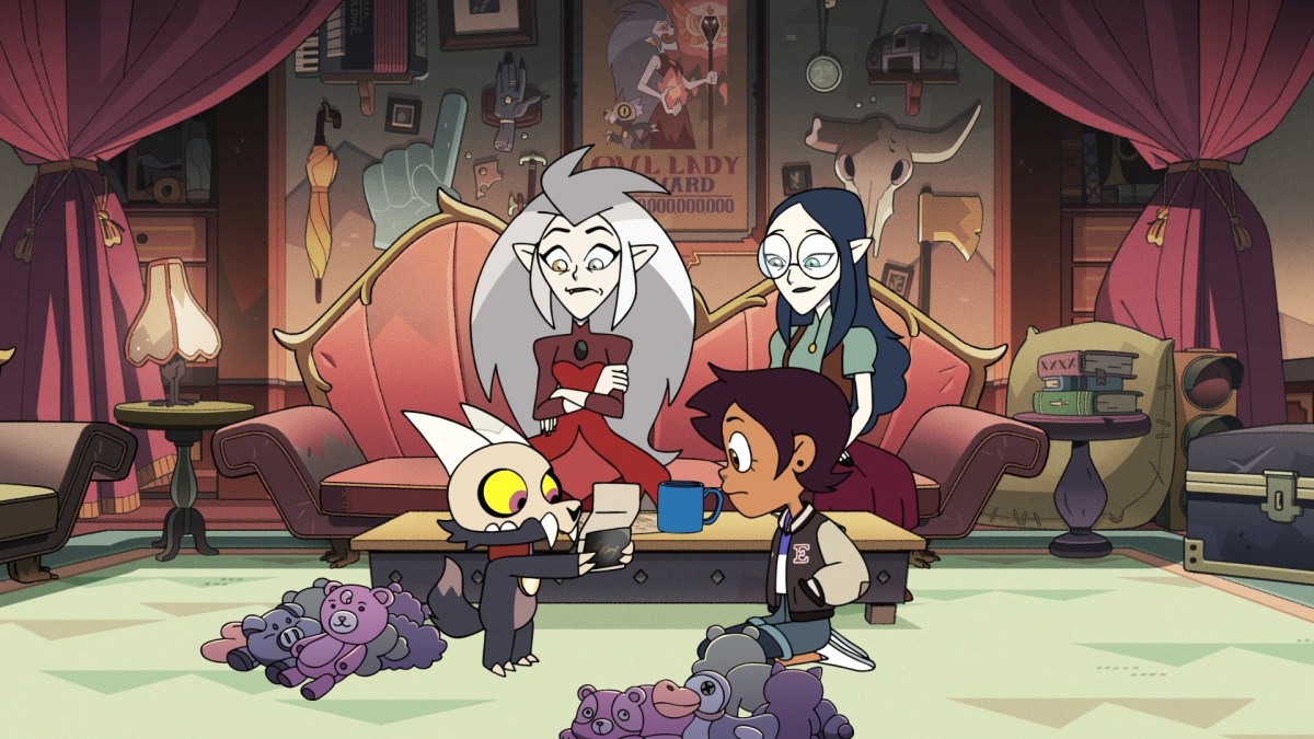Eda rubs King to wake him from his deep sleep. He jolts awake asking what’s wrong. Eda tells him she thinks Luz is finally ready to talk as they watch Luz siting sullenly in the living room. Luz sits under a blanket with a hot mug steaming in her hands as she tells Eda, King and Hooty about her journey into Belos’ mind. They all have looks of shock on their faces. Eda says it’s a lot to take in. Luz stands up upset saying they don’t have time and they have to stop Belos. She’s distraught that she unwillingly helped his plans. Hooty wraps himself around Luz in a hug and King joins.