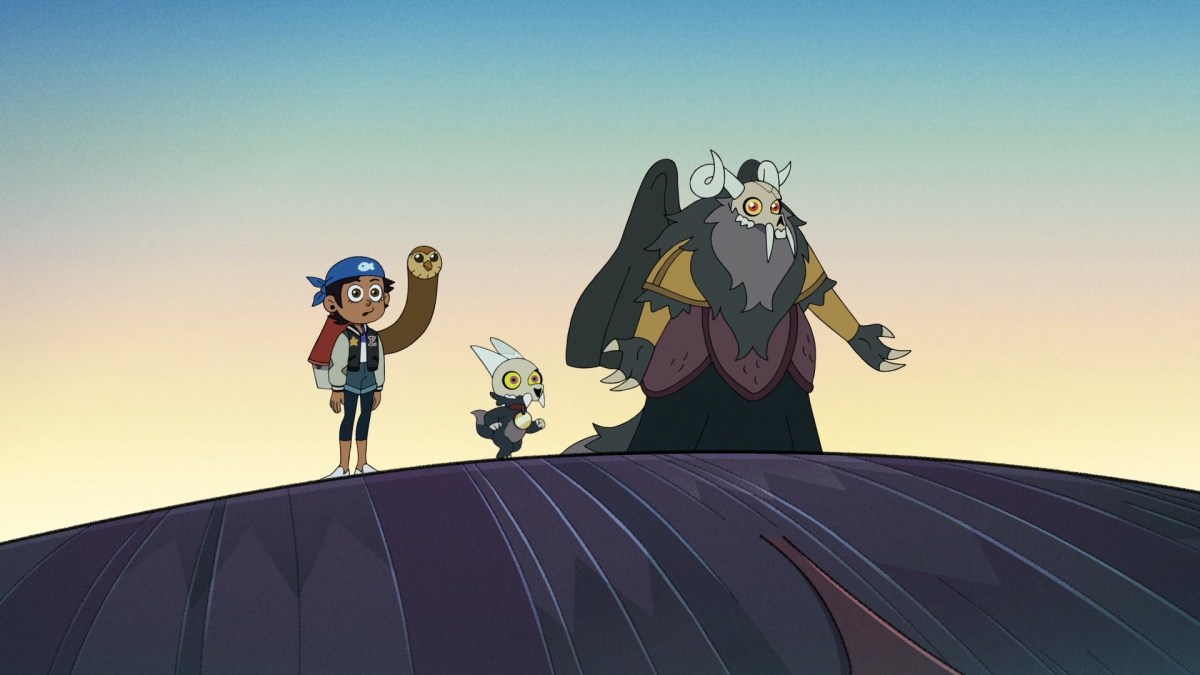 Hooty checks if everyone is okay. They look around and note it doesn’t look like the Boiling Isles. A booming voice from behind tells them it’s not. A giant looming figure approaches and welcomes them to the other side of the world. He then becomes offended that they trespassed when he suddenly notices King. He tells them his name is Tarak and his demeanor gets much friendlier. King asks if he is the one who sent the letter and if he’s his father. He says his father isn’t there but he did send the letter. Tarak tells them everyone will be excited to meet them. They look over the ledge and Tarak welcomes them to Titan Trapper Island. King’s eyes bulge as he gasps.