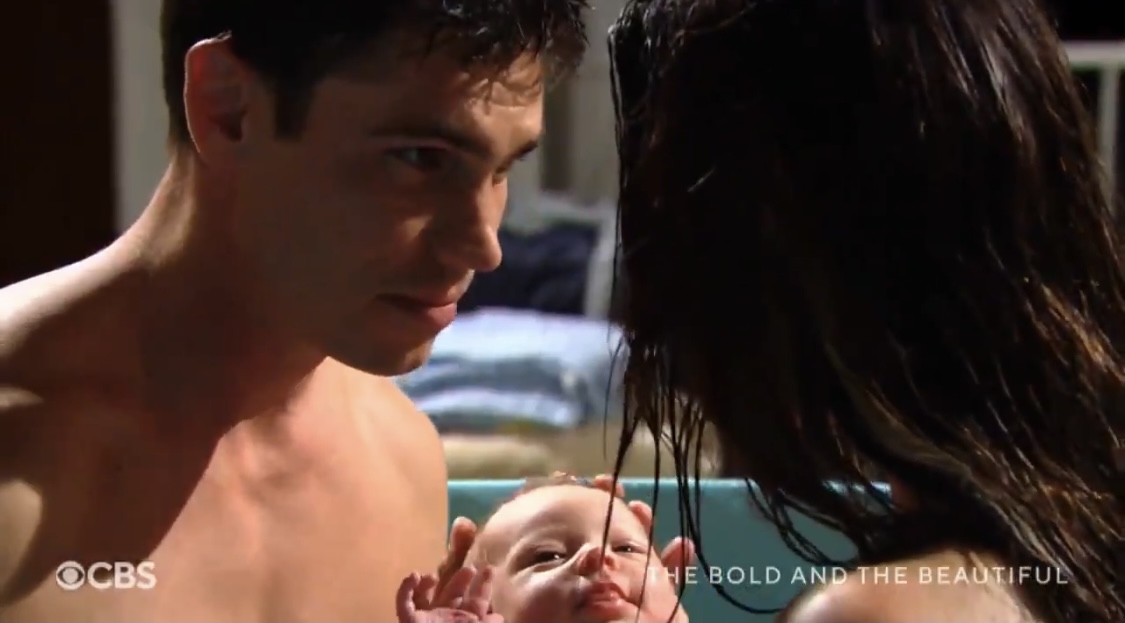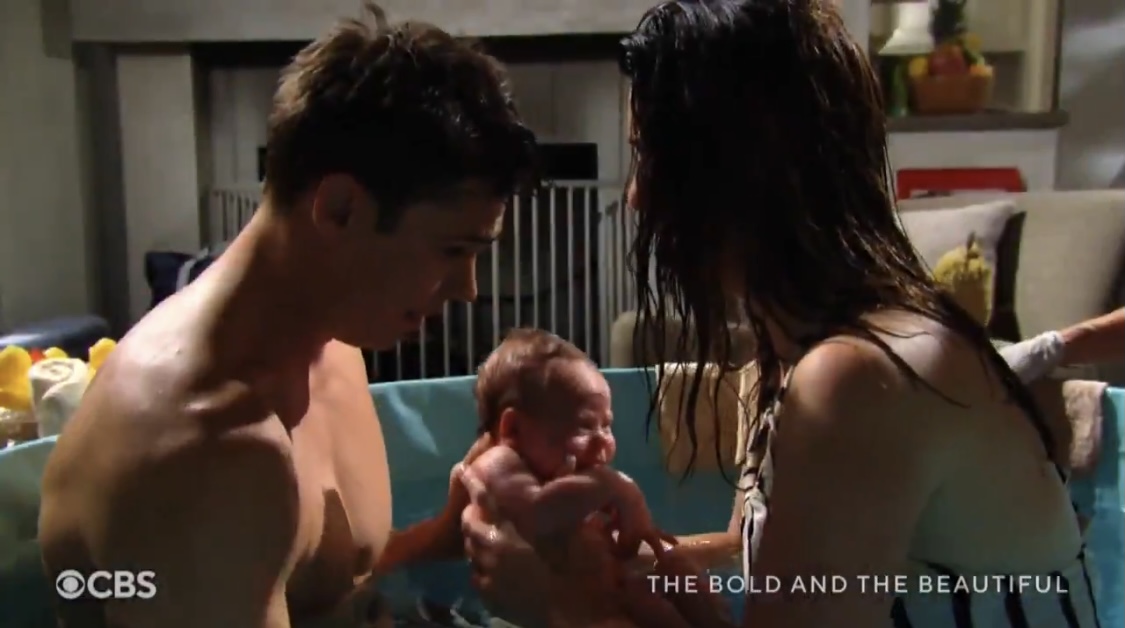 This week’s promo for the birth of Steffy and Finn’s son displays an array of moments that were sorely missing from her last pregnancy. Moments like father of her child being excited and raving about his child and praising her for doing the tough job of giving birth, him holding her hand and coaching her during the birth, and the love the two proud parents shower on their little bundle, promising to protect him. Another bonus is the fact that Finn is also a doctor and gets to play an active role alongside Steffy and the midwife in assisting with the water birth of his son. The moments shown to us appear to be very intimate and beautiful.